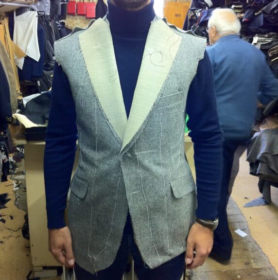 Vestes, costumes, manteaux, pantalons ou chemises sont réalisés à partir de patrons précis et d’un large choix de tissus.