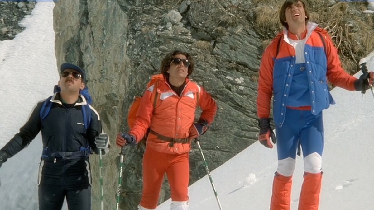 Les années quatre-vingt-dix et leurs combinaisons colorblock subliment les deux crétins géniaux sortant de leur Lamborghini Diablo. Une caricature assumée du luxe américain version neige. Mention à la veste croisée matelassée en tissu navajo Woolrich, improbable mais mémorable.