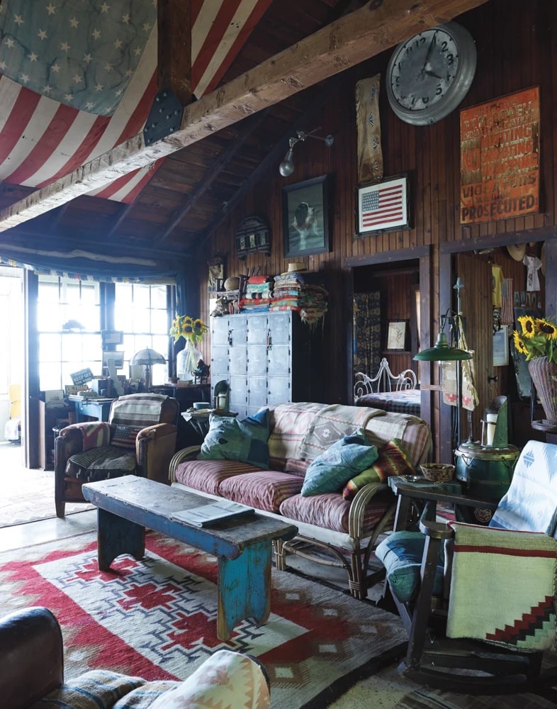 Quelques années plus tard, il rejoint la maison. Sa mission : trouver les objets qui raconteront cette Amérique-là. Il chine dans les entrepôts anglais, les marchés de Brimfield, les granges oubliées. Des couvertures Navajo trouées, des bottes d’équitation, des toiles équestres patinées.