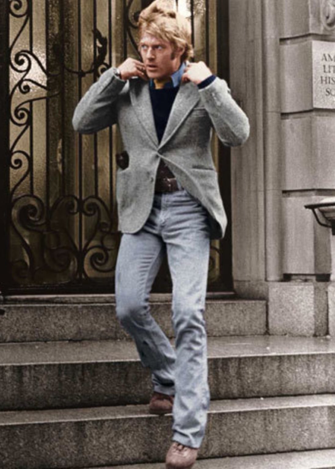 Dans Three Days of the Condor, la veste en tweed à chevrons gris reste la référence absolue du style Ivy. Dans The Way We Were, le col roulé blanc emprunté aux mariniers devient une signature minimaliste. Dans A Bridge Too Far, la field jacket militaire rappelle l’Amérique en uniforme, héritage utilitaire devenu basique du vestiaire.
