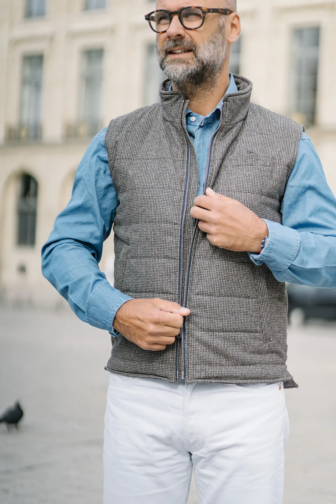 Nos amis Italiens raffolent de ce type de porté. Cela donne un style décalé qui réveille le blazer et la tenue. Il a un vrai avantage ; il permet de ne pas avoir un brin d’air qui s’engouffre à l’intérieur de votre blazer lorsque vous êtes à vélo par exemple. C’est souvent une tenue « d’urgence » on va dire ; vous êtes en voyage, vous devez vous déplacer à deux roues par exemple ou marcher un long moment à l’extérieur. Il fait frais. Vous n’avez qu’une veste de sport ou vous êtes en costume. Vous avez votre gilet matelassé sans manches dans votre sac. Hop, vous le sortez et l’enfilez par-dessus votre veste. Vous êtes isolé du froid ! Vous l’enlèverez à votre prochain rendez-vous !