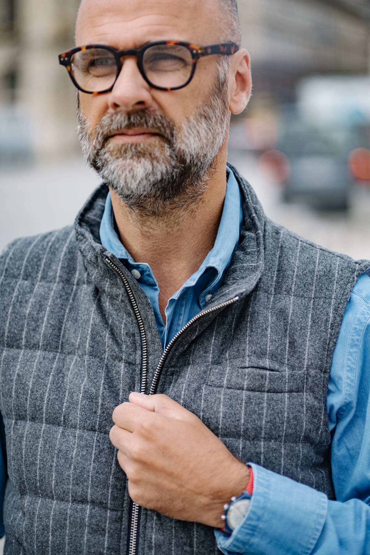 Nos amis Italiens raffolent de ce type de porté. Cela donne un style décalé qui réveille le blazer et la tenue. Il a un vrai avantage ; il permet de ne pas avoir un brin d’air qui s’engouffre à l’intérieur de votre blazer lorsque vous êtes à vélo par exemple. C’est souvent une tenue « d’urgence » on va dire ; vous êtes en voyage, vous devez vous déplacer à deux roues par exemple ou marcher un long moment à l’extérieur. Il fait frais. Vous n’avez qu’une veste de sport ou vous êtes en costume. Vous avez votre gilet matelassé sans manches dans votre sac. Hop, vous le sortez et l’enfilez par-dessus votre veste. Vous êtes isolé du froid ! Vous l’enlèverez à votre prochain rendez-vous !