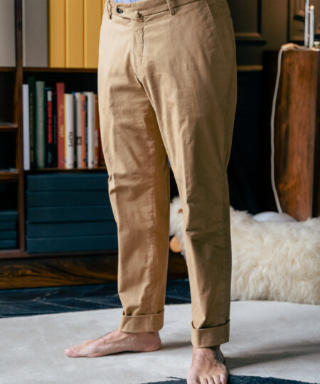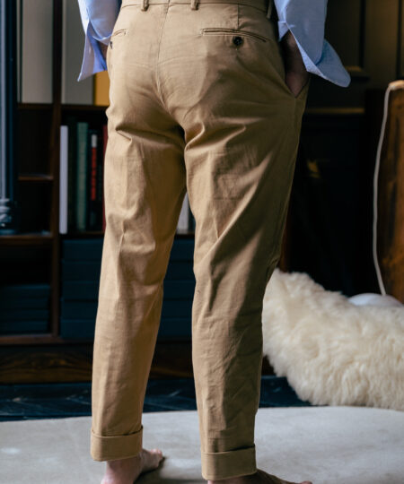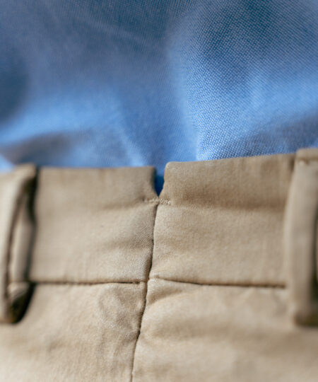 Nos pantalons ont une hauteur de ceinture normale (ni taille haute, ni taille basse). Le bas du pantalon n'est pas fini, il a une longueur suffisante pour faire réaliser un revers de 5 cm par exemple.