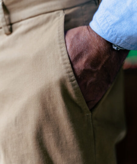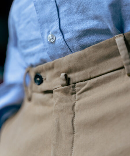 En version estivale ici avec un coton italien de la maison Duca Visconti comportant 2% d’élasthanne, 280 gr/ml, pour un maximum de confort.
