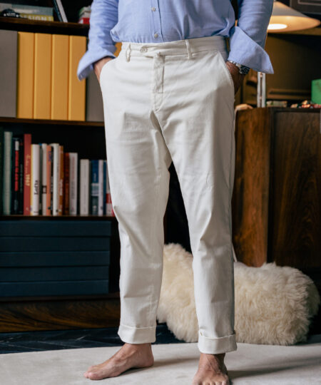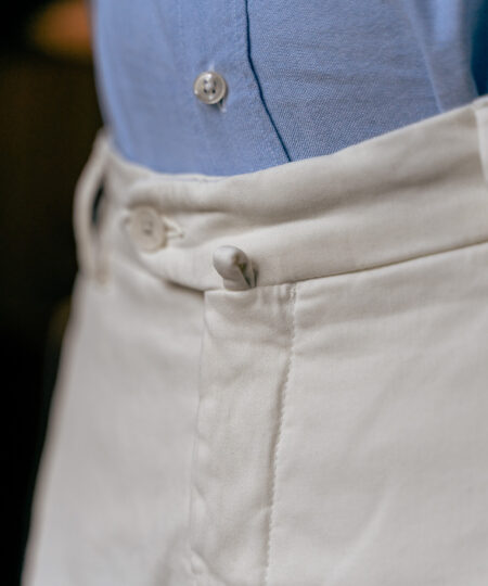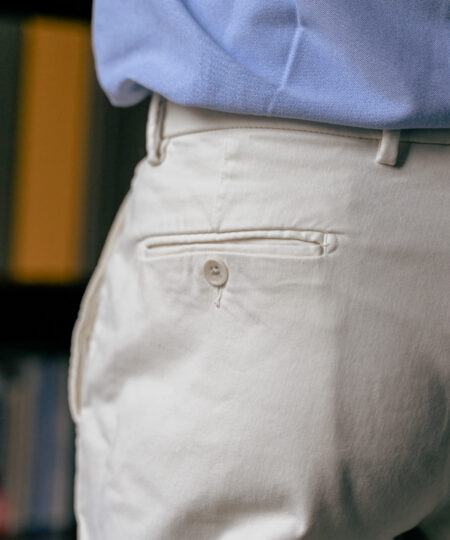 En version estivale ici avec un coton italien de la maison Duca Visconti comportant 2% d’élasthanne, 280 gr/ml, pour un maximum de confort.