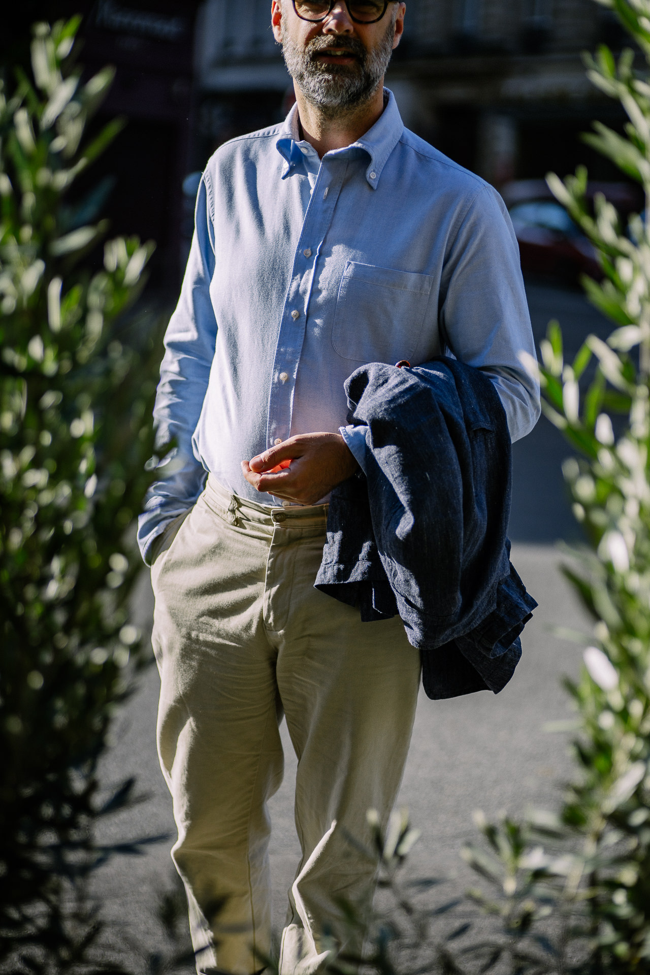 Tout l’esprit de la slack jacket inventée par Brooks Brothers en 1918 avec le modèle Number One ; épaules naturelles, revers larges mais pas trop, construction souple, une fente arrière, deux poches plaquées, 3 boutons avec le revers enroulant le 3ème jusqu’au bouton du milieu.