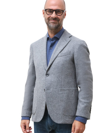 Elle est montée sans doublure ni rembourrage aux épaules avec une coupe fluide, résolument italienne.