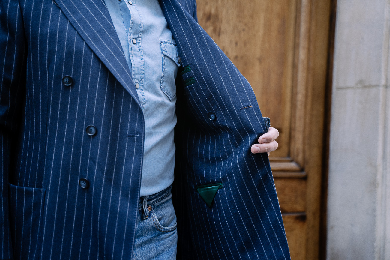 Les boutons en corne sont cousus à la main. Les poches plaquées en forme de goutte d’eau sont dessinées à la main également comme la poche poitrine légèrement incurvée appelée poche pagode. La veste possède de vraies boutonnières qui s’ouvrent.