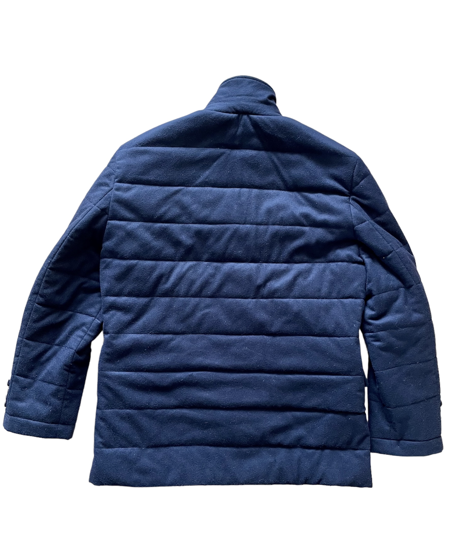 Une veste matelassée, version 100% cachemire déperlant, munie d'une fermeture éclair pouvant se fermer comme une parka. Un produit deux en un parfait un hiver grand luxe.
